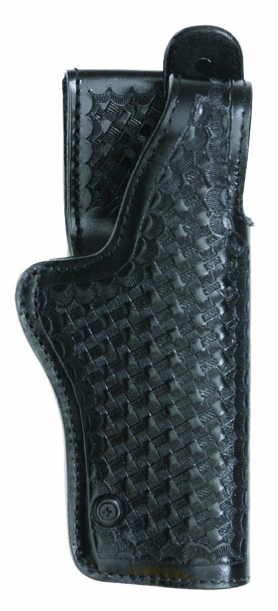 The basket weave gun holster is made from genuine leather, providing a professional look suitable for any law enforcement officer. The holster comes in black and fits the S&W 9mm, Glock 9mm, and Glock 40 w/rail handguns.