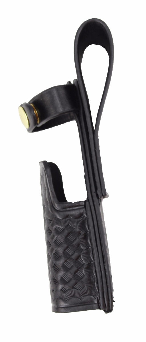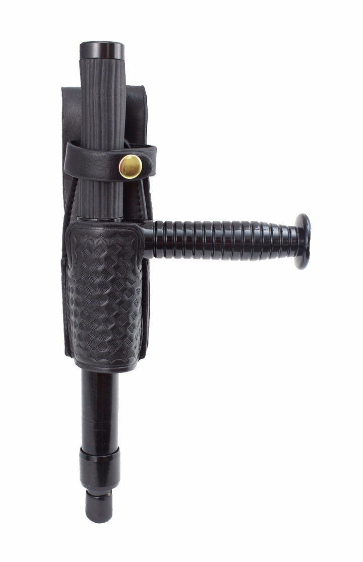 The easy access collapsible baton holder is made from high quality synthetic leather, giving it a more professional look while maintaining high durability. This accessory keeps any baton inserted safe and secure. The holder comes in a black basket weave design with a visible gold snap.