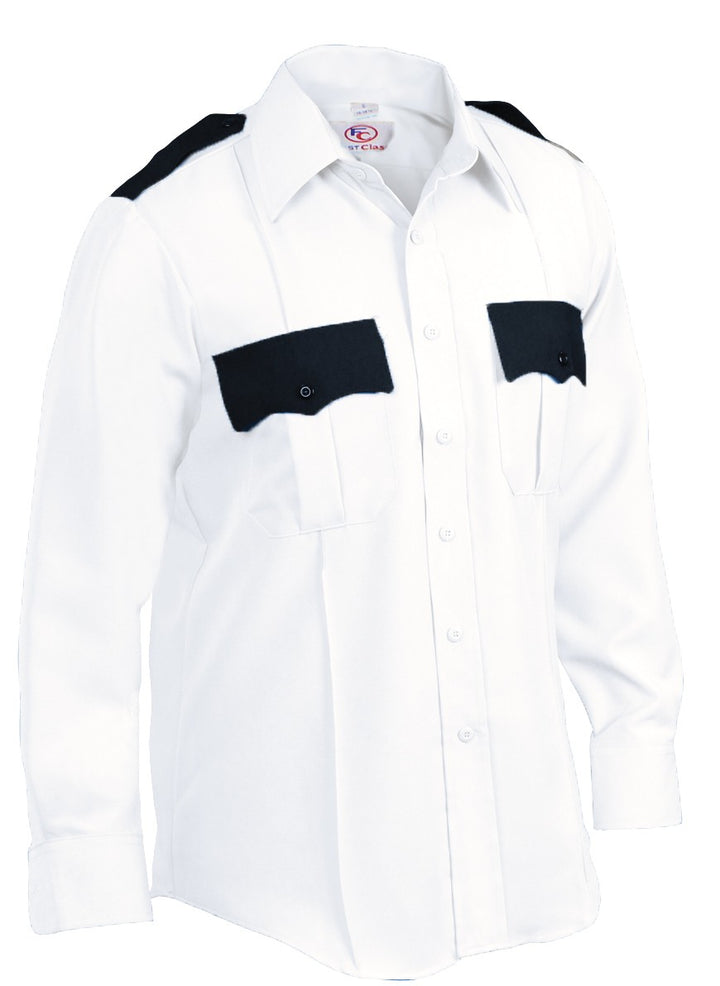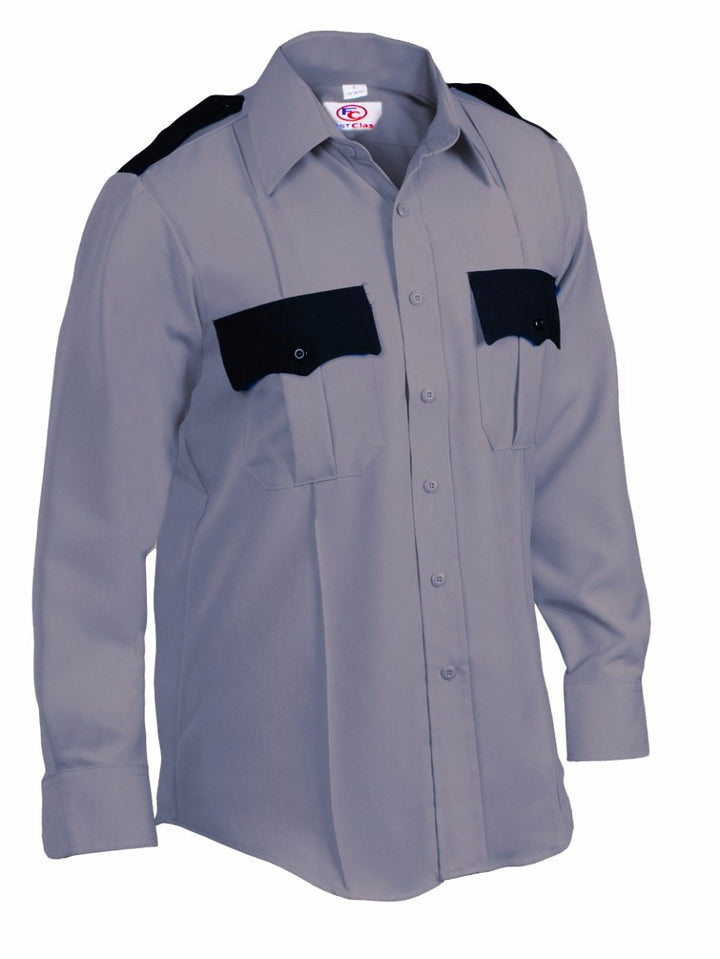 First Class Apparel is worn by Security Guard, Law Enforcement, Medical Transport and other Public Safety professionals, this Two Tone uniform shirt is constructed of premium polyester fabric, sewn-in military style creases and button down epaulets providing a wrinkle free, crisp professional appearance.