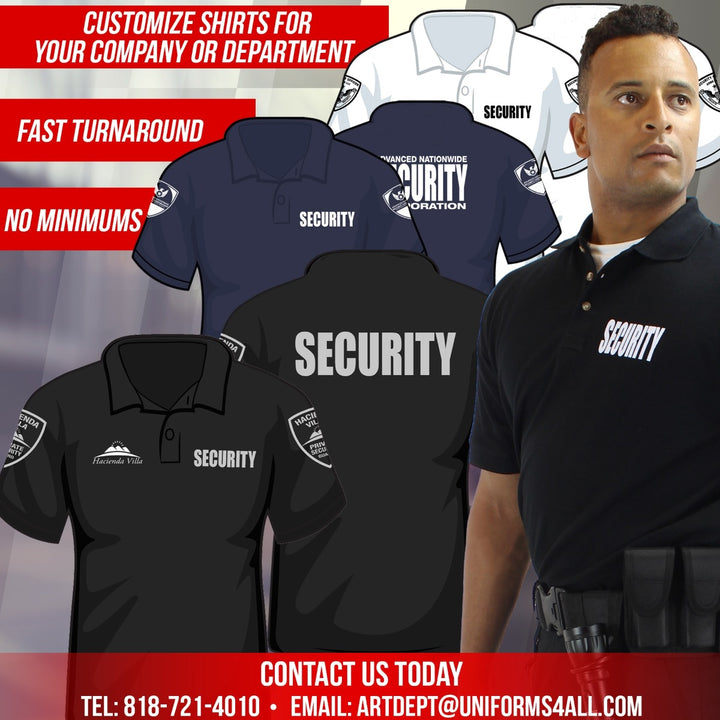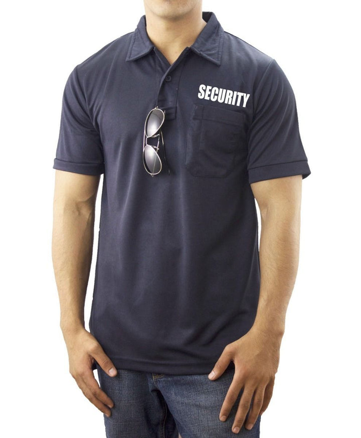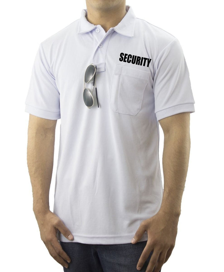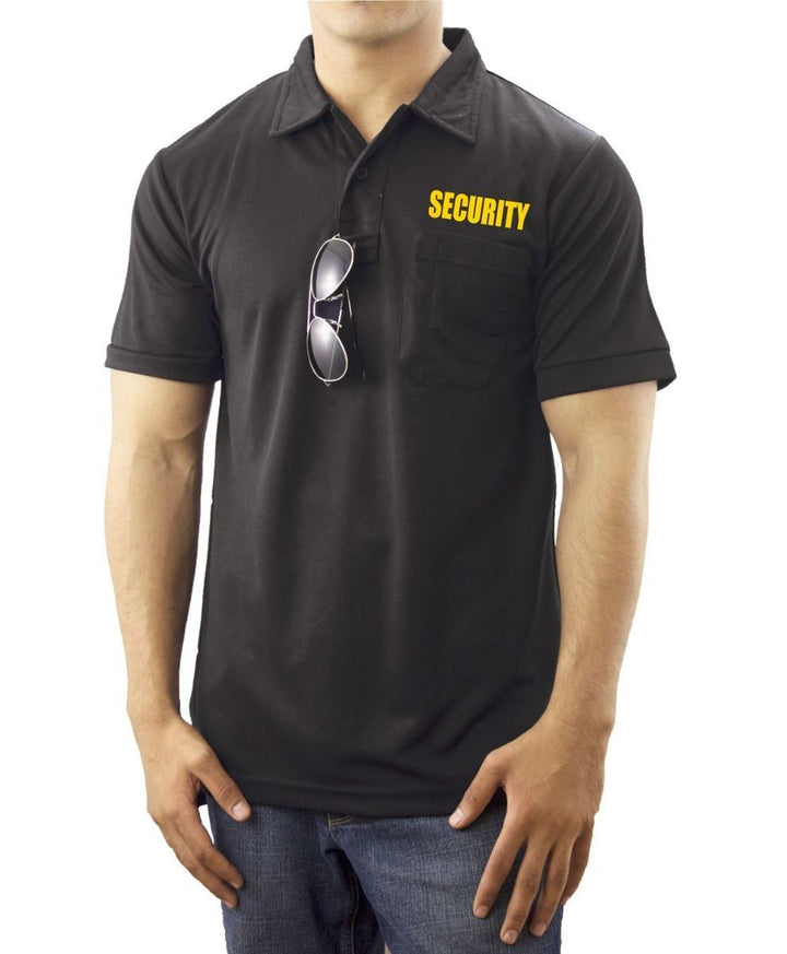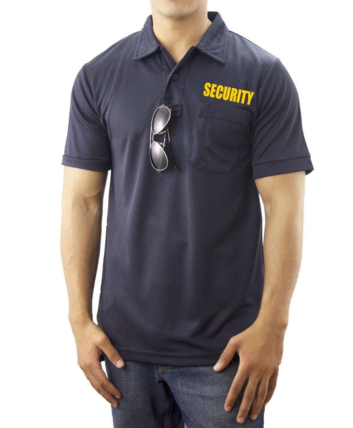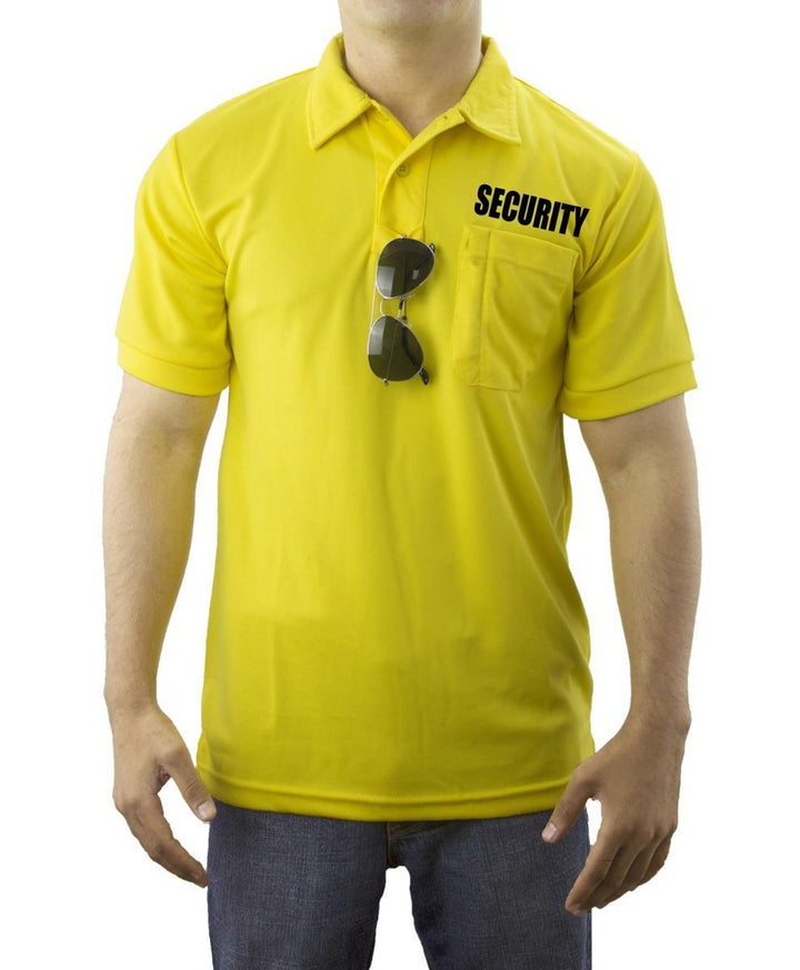 The 100% Polyester Pro-Dry Security Polo Shirts are durable shirts made from moisture-wicking material to keep you dry. They are featured with mic or glasses loop under buttons, one pocket on left chest, and pen pocket next to pocket. The shirts come in black, navy blue, white, and yellow with Security printed on the front and back in white, black, or gold letters.