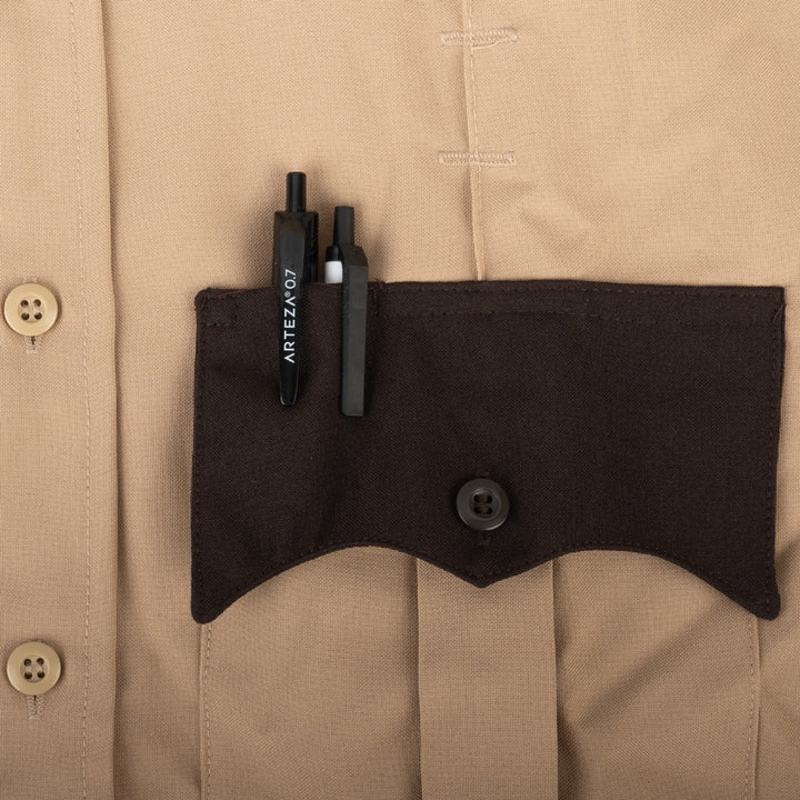 Along with a Velcro Chest Pocket, stay organized and efficient with the pen compartment on the left front pocket, providing easy access to your writing essentials whenever you need them. -