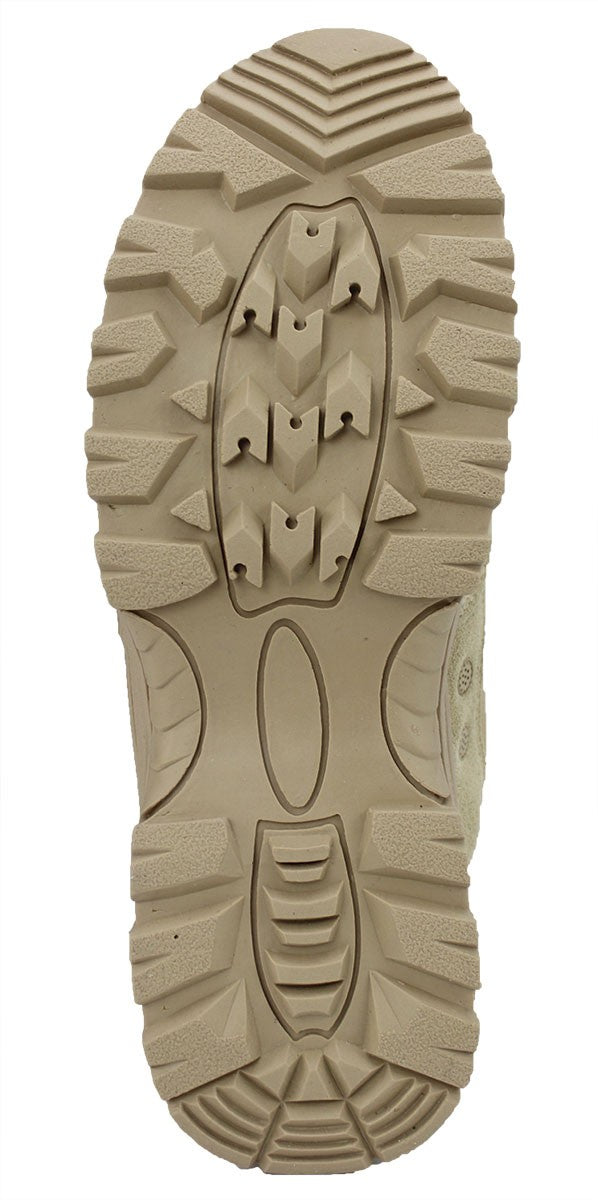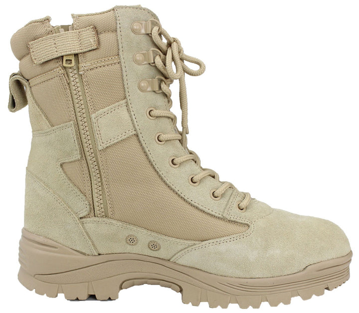 The 8" Ryno Gear Combat Boots are made from leather and ballistic nylon, providing the perfect blend of comfort and high durability. Its interior is featured with a removable shock absorbent insole for your convenience and water resistant inner lining. Its slip-resistant rubber outer sole provides grip to prevent any accidental falls while walking or running. These boots come in beige.