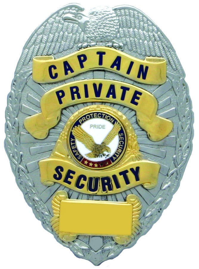 The First Class Captain Private Security Gold on Silver Shield Badge reads Captain Private Security in navy text with a centered image of an eagle. The badge's dimensions are 3 ¼" x 2 ½" and an option to engrave your own custom ID (up to four characters) is available.