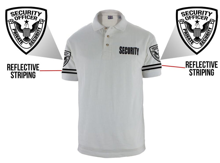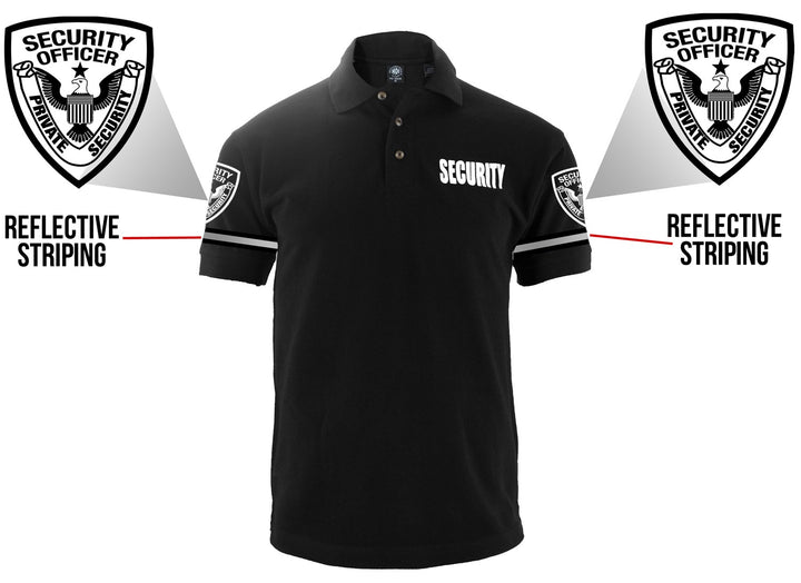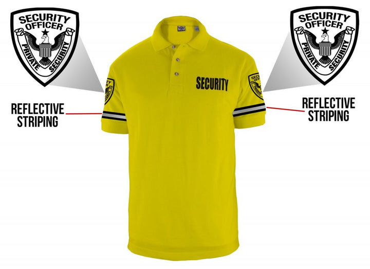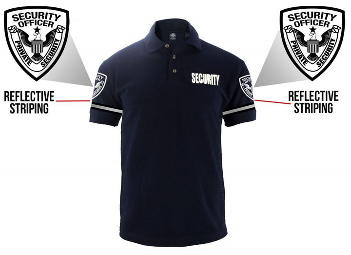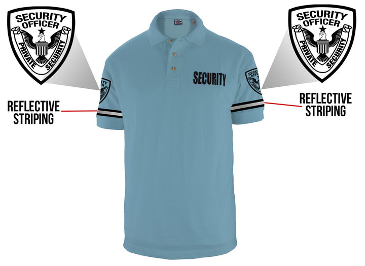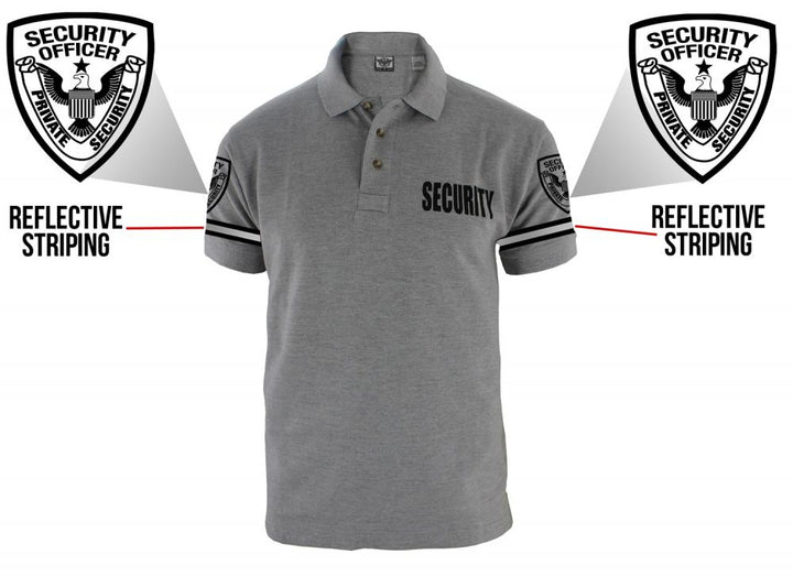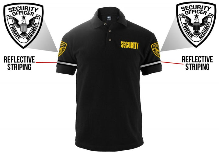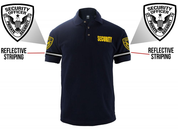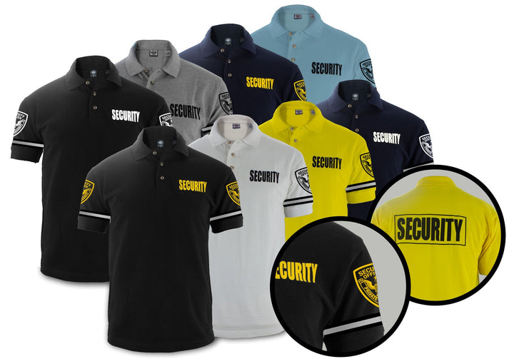 The Customizable Poly Cotton Security Polo Shirt is made from polyester and cotton, ensuring high durability as well as comfort. It is featured with reinforced stitching along seams and vented sides for secure tucking. The polo shirt has the option of having reflective striping to the sleeves and a Security design on the shoulders. It comes in black with white or gold ID, white with black ID, navy blue with white or gold ID, yellow with black ID, sky blue with black ID, or heather gray with black ID.
