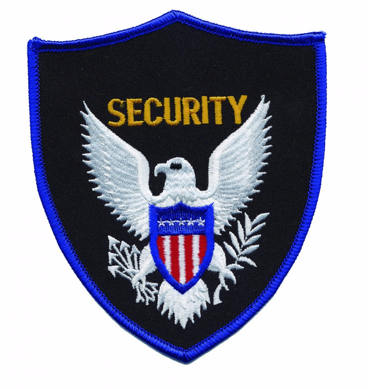 The Security Shoulder Patch reads Security in gold letters above an image of an eagle in white, all printed on a black background with a blue border. The patch's dimensions are 5" x 4" and it is sold individually.