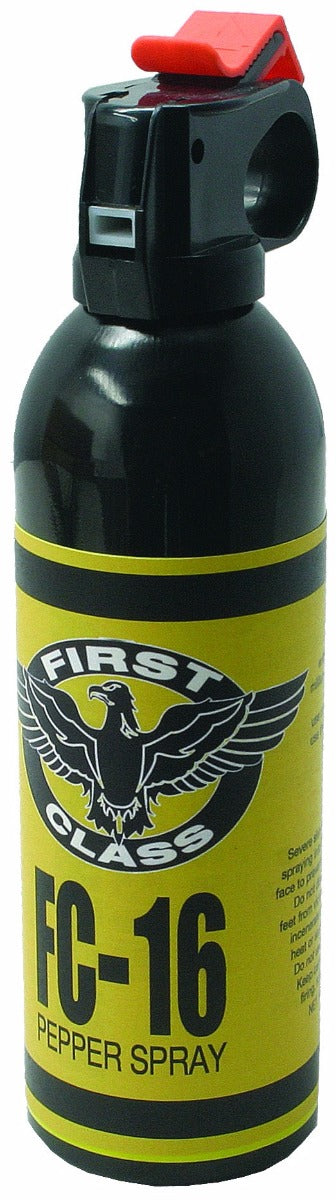 The First Class pepper spray is a valuable means of protection for anyone in case of an attack. This bottle is 16 ounces.