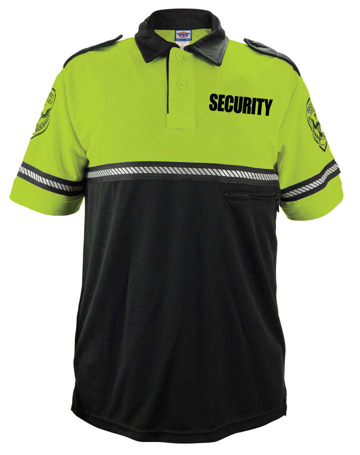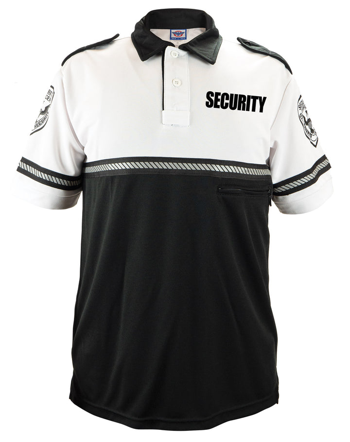 First Class Security and Patch Two Tone Bike Patrol Polo Shirt with Zipper Pocket and Reflective Hash Stripes