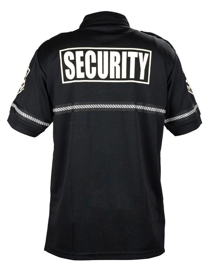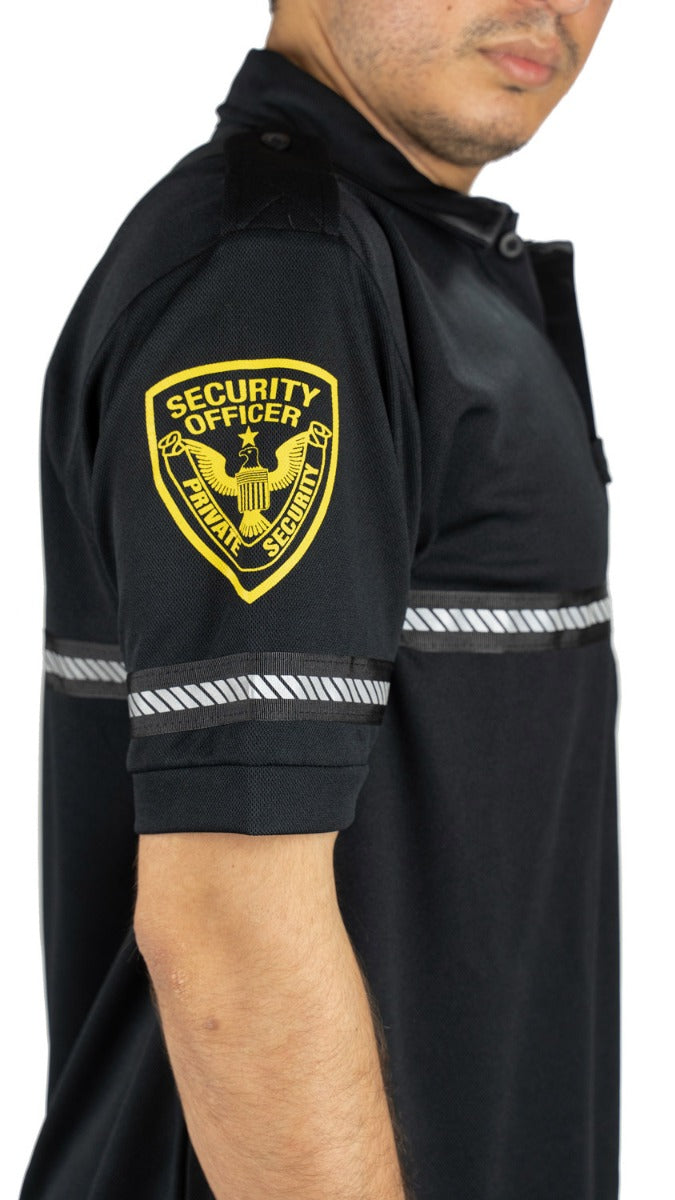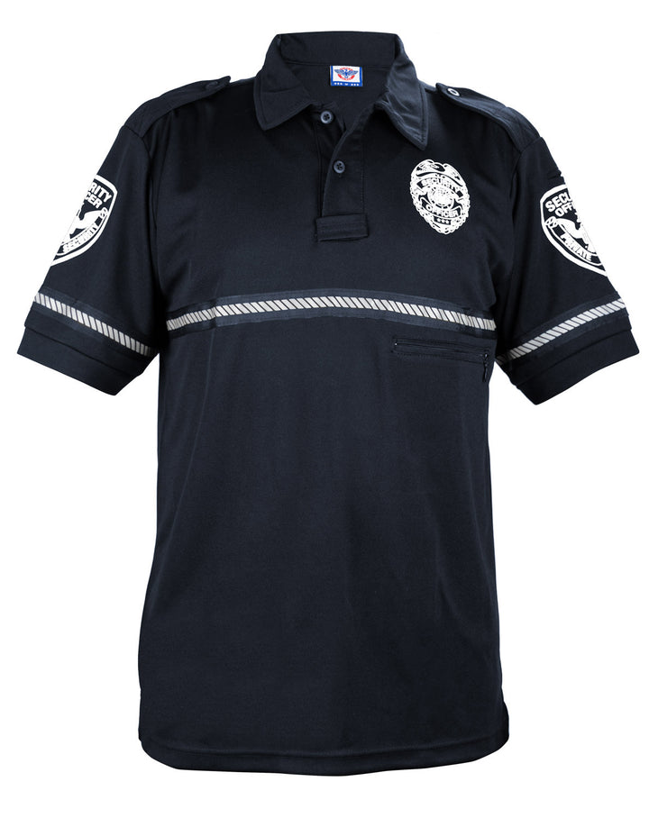 First Class Security Badge and Patch Bike Patrol Polo Shirt with Zipper Pocket and Reflective Hash Stripes
