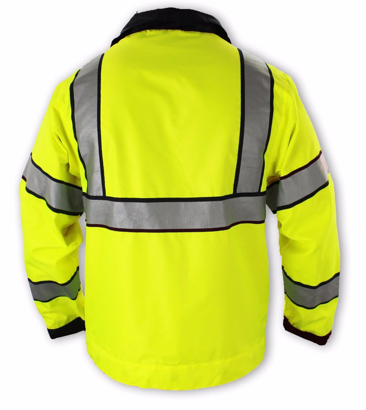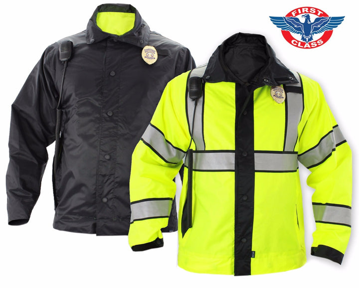 The Reversible High Visibility Raincoat is made from 100% nylon oxford material and is waterproof due to its seam sealed construction. The raincoat can be switched easily from its highly visible green side with reflective stripes to the dark, more professional appearance.