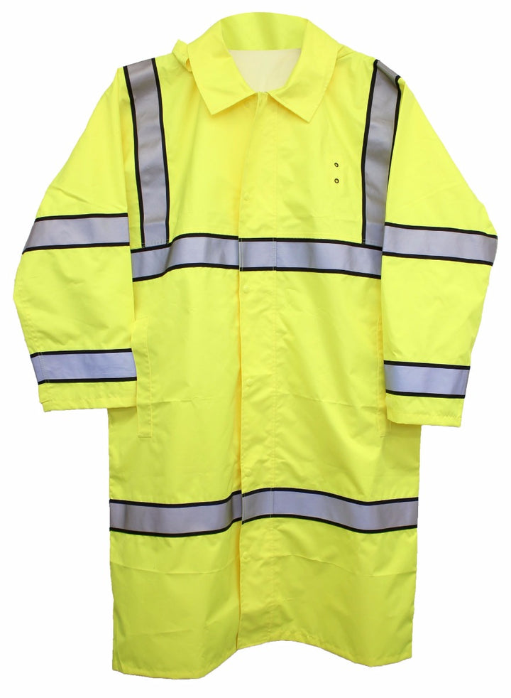 The Long High Visibility Raincoat with Reflective Stripes is made from 100% polyester 300 Oxford PU coated material. It is detailed with 2" wide high reflective tapes to further improve visibility. The raincoat has a zipper front and a removable snap-on drawstring hood to allow you to adjust the size of the hood to your liking.