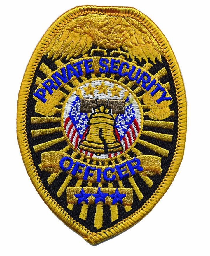 The Private Security Officer Chest Patch reads Private Security Officer with a picture of the liberty bell between two U.S. flags and underneath three gold stars. The text is in blue and on a gold and black background. The patches are sold individually.
