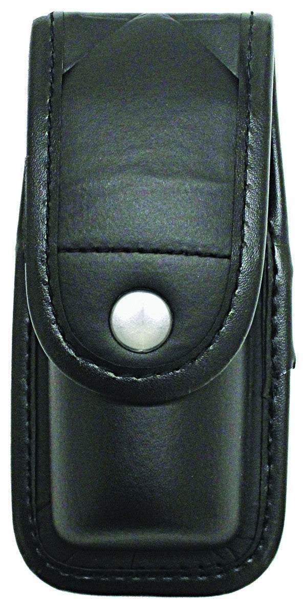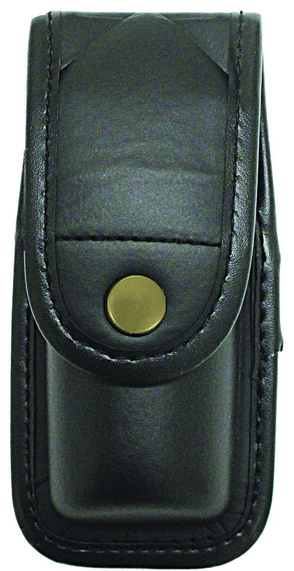 This small pepper spray holder is made from high quality synthetic leather which ensures high durability as well as a professional appearance. It comes in a black plain design with either a nickel, gold, or black snap.