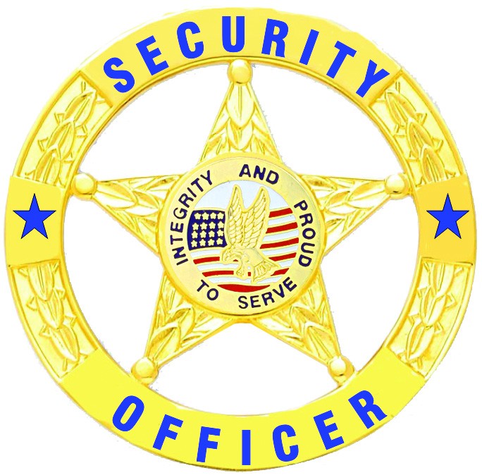 The First Class Security Officer Gold 5-Star in Circle Badge reads Security Officer in blue text with a centered image of the US flag and eagle. The badge has hard enameled seals, deluxe backings, and lacquered finish, and its dimensions are 3" x 3".