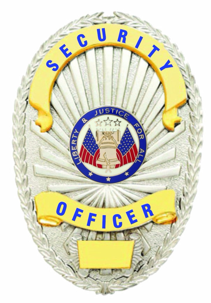 The First Class Security Officer Gold on Silver Shield Badge reads Security Officer in blue letters with a centered image of the liberty bell flanked by two US flags. The badge has hard enameled seals, deluxe backings, and lacquered finish, and its dimensions are 3⅜" x 2¼".