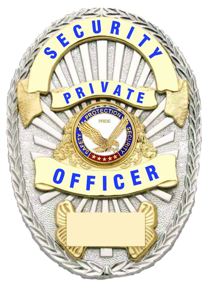 The First Class Security Private Officer Gold on Silver Shield Badge reads Security Private Officer in blue text with a centered image of an eagle. The badge has hard enameled seals, deluxe backings, and lacquered finish, and its dimensions are 3⅜" x 2⅜".