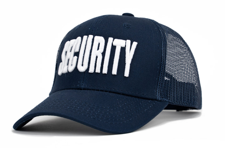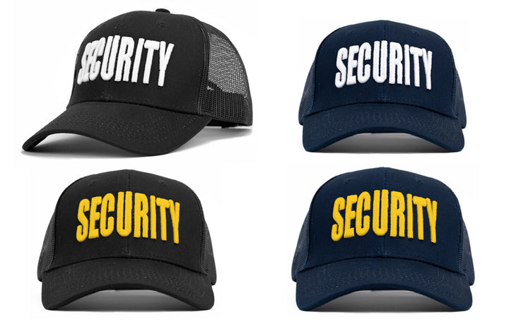 These caps have an adjustable head band with a snap on the back, allowing them to comfortably fit on your head. Its buckram front construction ensures the cap remains durable for long use, and the mesh back keeps you feeling cool on hot days. The caps can come in black and navy blue and read Security in embroidered gold or white letters.