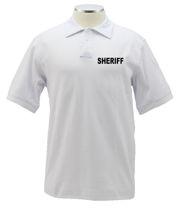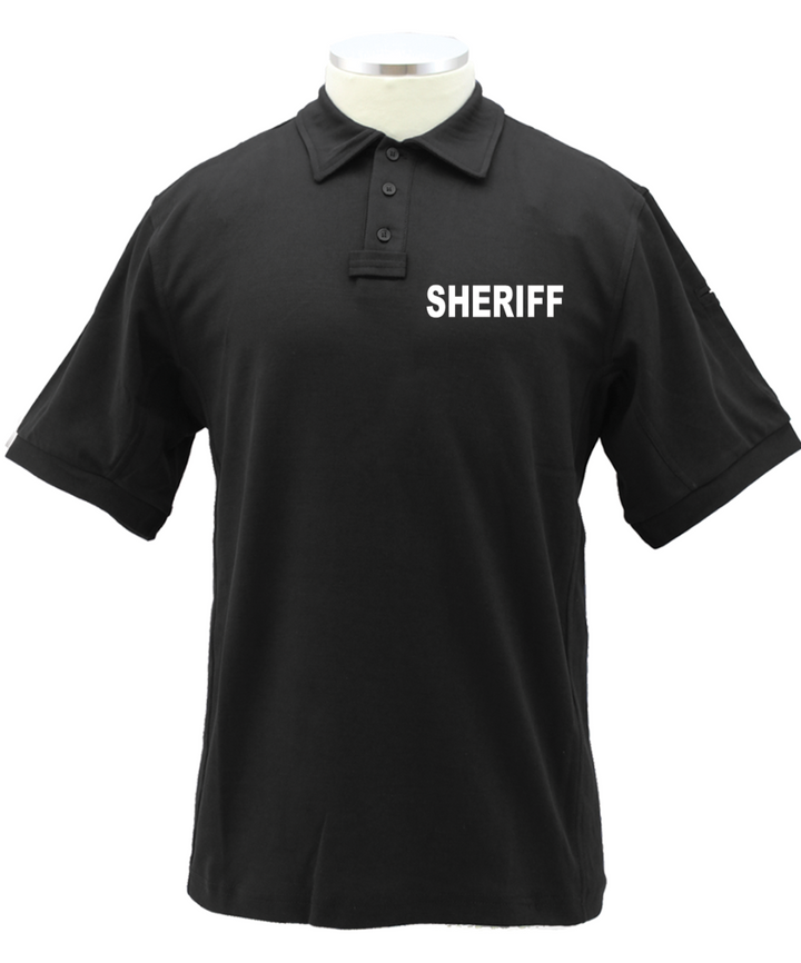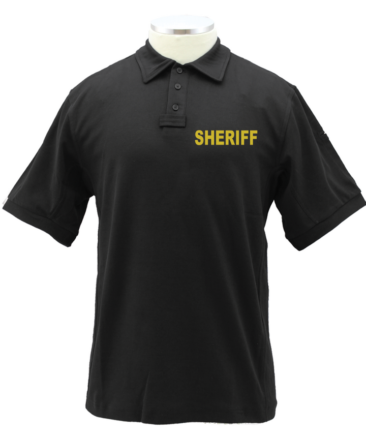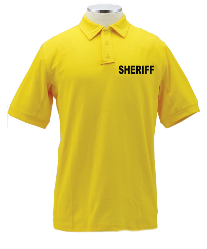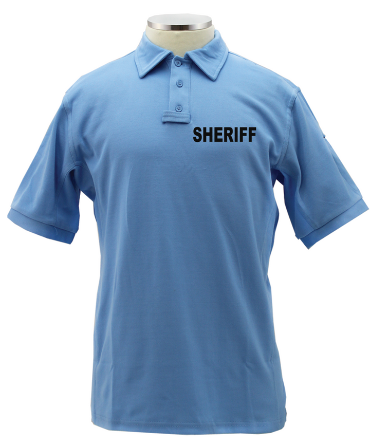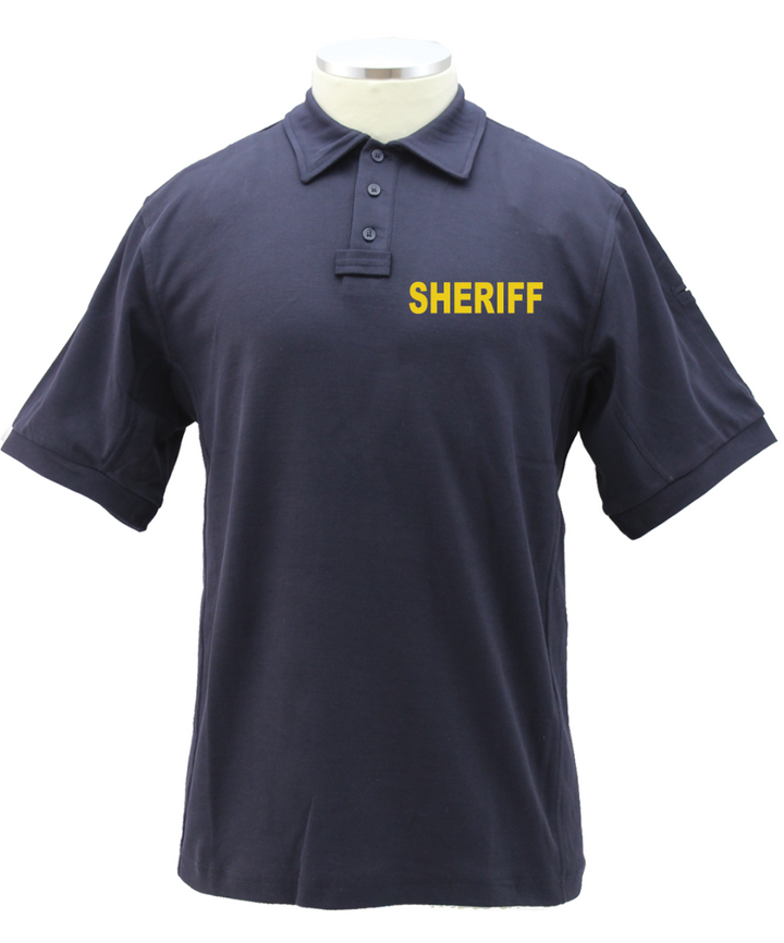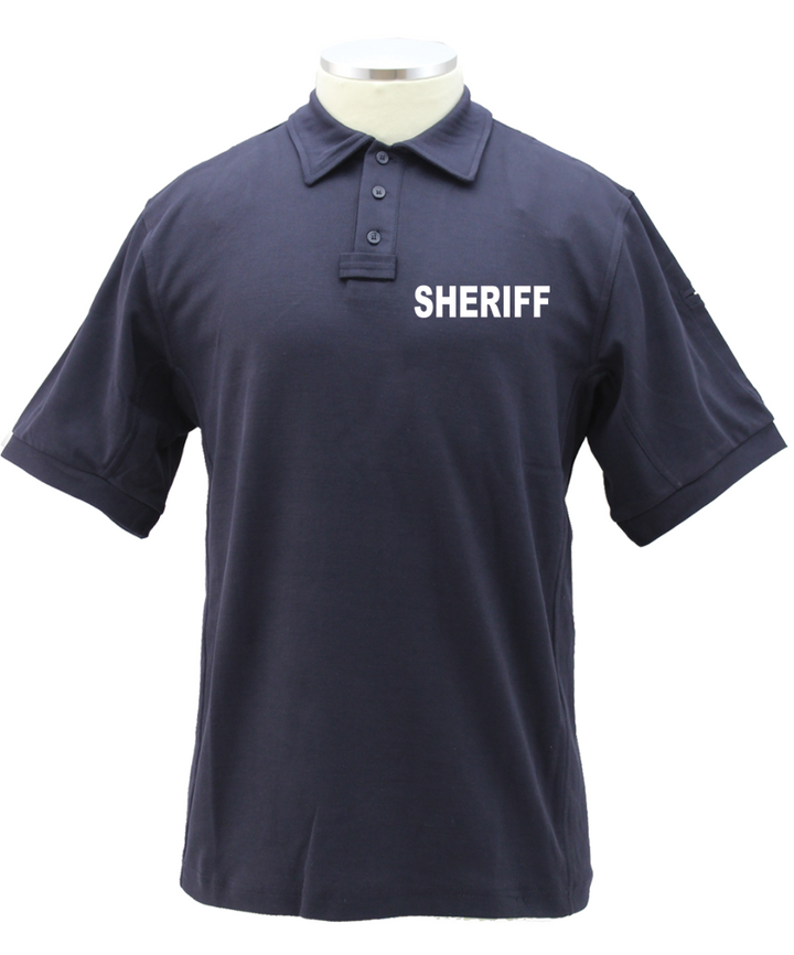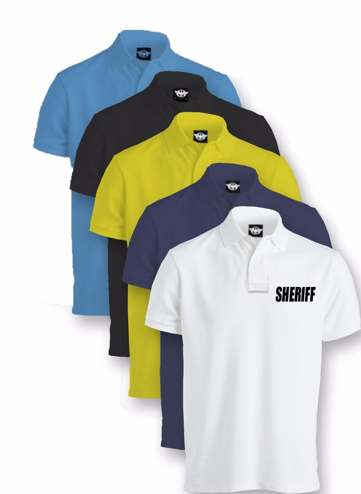 The Sheriff Tactical Performance Polo Shirts are made from polyester and cotton, providing high durability as well as great comfort. Their moisture management fabric keeps you dry, and they are stain and wrinkle resistant. The shirts are featured with a mic holder on both shoulders and below front buttons, a pen pocket on the left sleeve, and hemmed sleeves. They come in black and navy blue with Sheriff printed on the back and front in white or gold letters, and in white, yellow, and sky blue with Sheriff printed in black letters.