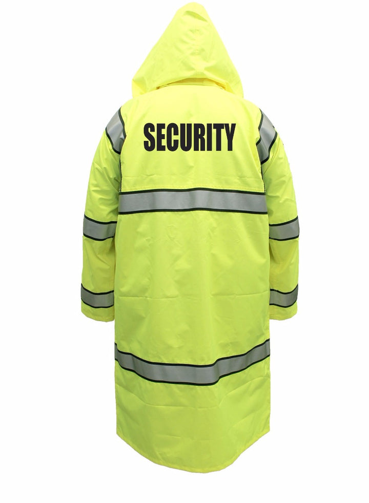 The Security High Visibility Raincoat with Reflective Stripes are made from 100% polyester 300 Oxford PU coated material. It is detailed with 2" wide high reflective tape to enhance the visibility of the raincoat. It is featured with a removable snap-on drawstring hood to allow you to adjust the size of the hood and comes with a Security label on the back and front.