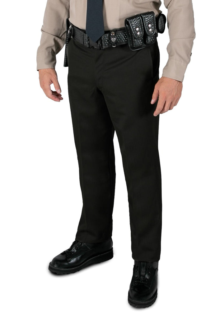 The Sinatra Medium Weight Black Uniform Pants are constructed from a 55/45 Poly Wool blend with a SnugTex waistband with hook-and-eye closure which keeps your shirt tucked in. There are straight front pockets, a watch pocket and billy pockets. The seat is fully lined with a french fly for additional support. Triangle bar tacks on the back pockets and bar tacks at key stress points add extra durability. There is also a pressed open tailored seam construction.