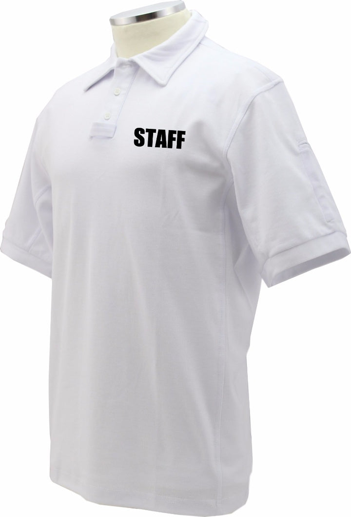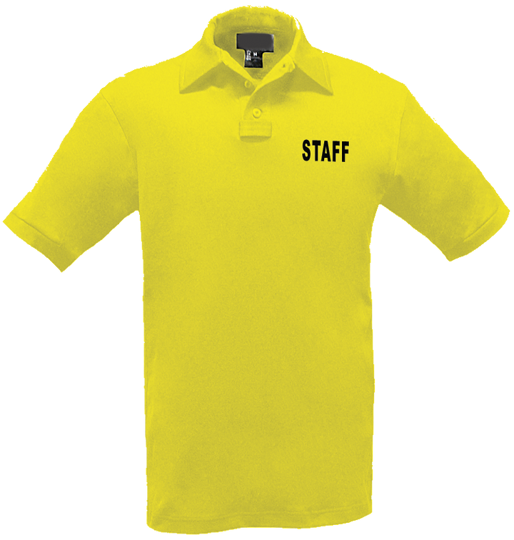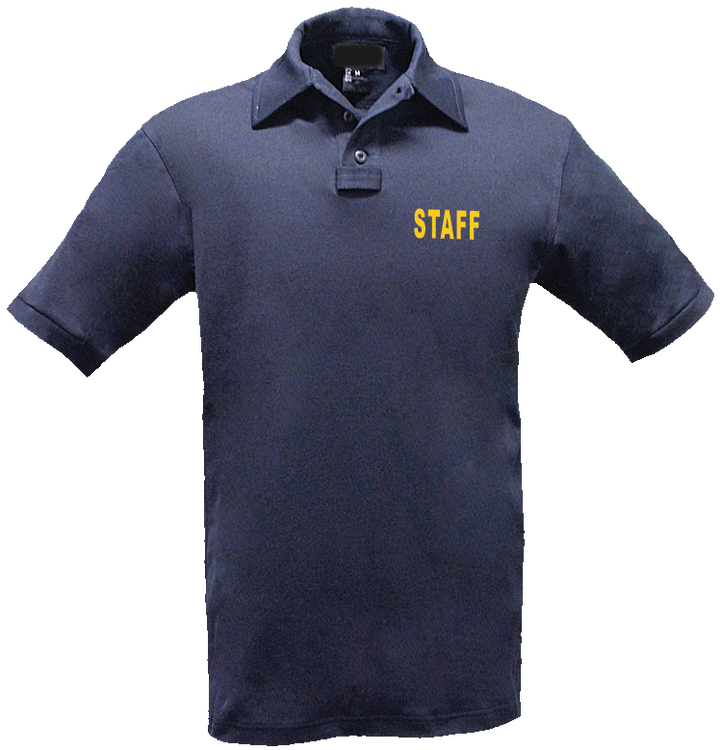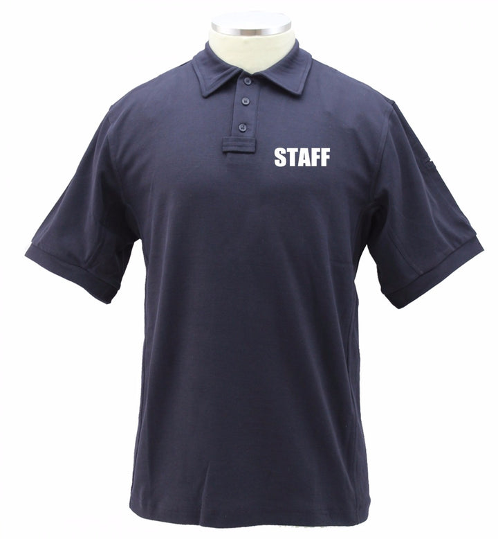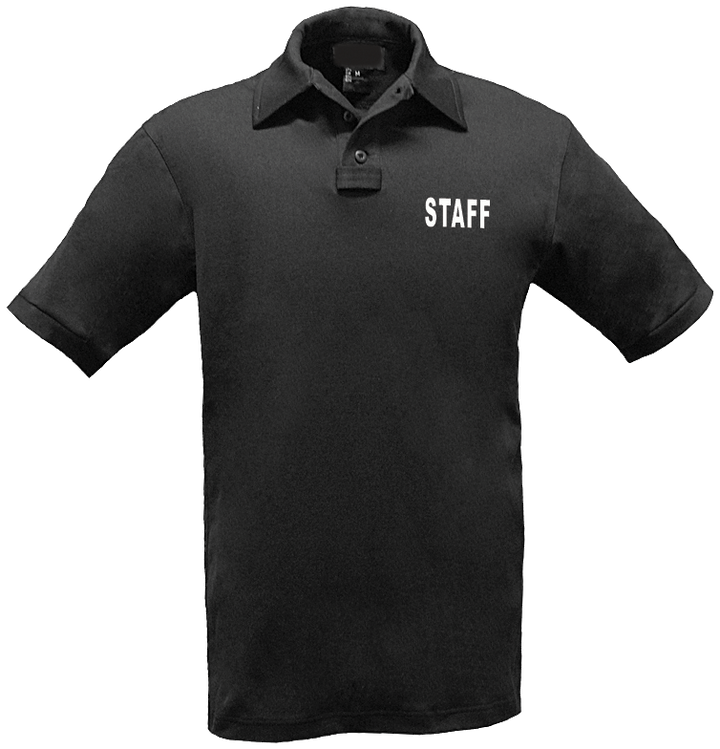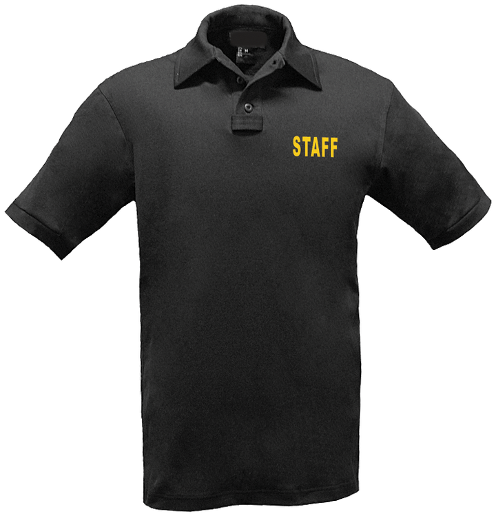 The Tactical Performance Staff Polo Shirts are made from polyester and cotton, providing both high durability and great comfort. The shirts are wrinkle free and stain resistant and their moisture management fabric keeps you dry. They are featured with hemmed sleeves, a mic holder on both shoulders and below front buttons, and a pen pocket on the left sleeve. The shirts come in black and navy blue with Staff printed on the back and front in white or gold letters, and they come in white, yellow, and sky blue with Staff printed in black letters.