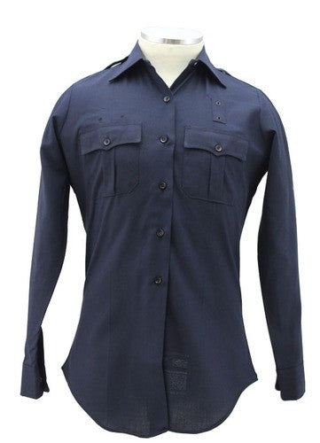 The Women's Long Sleeve Jaguar Tropical Shirts are made from 65% Dacron polyester and 35% Avril rayon, providing a blend of durability and comfort. The shirts come in navy blue.